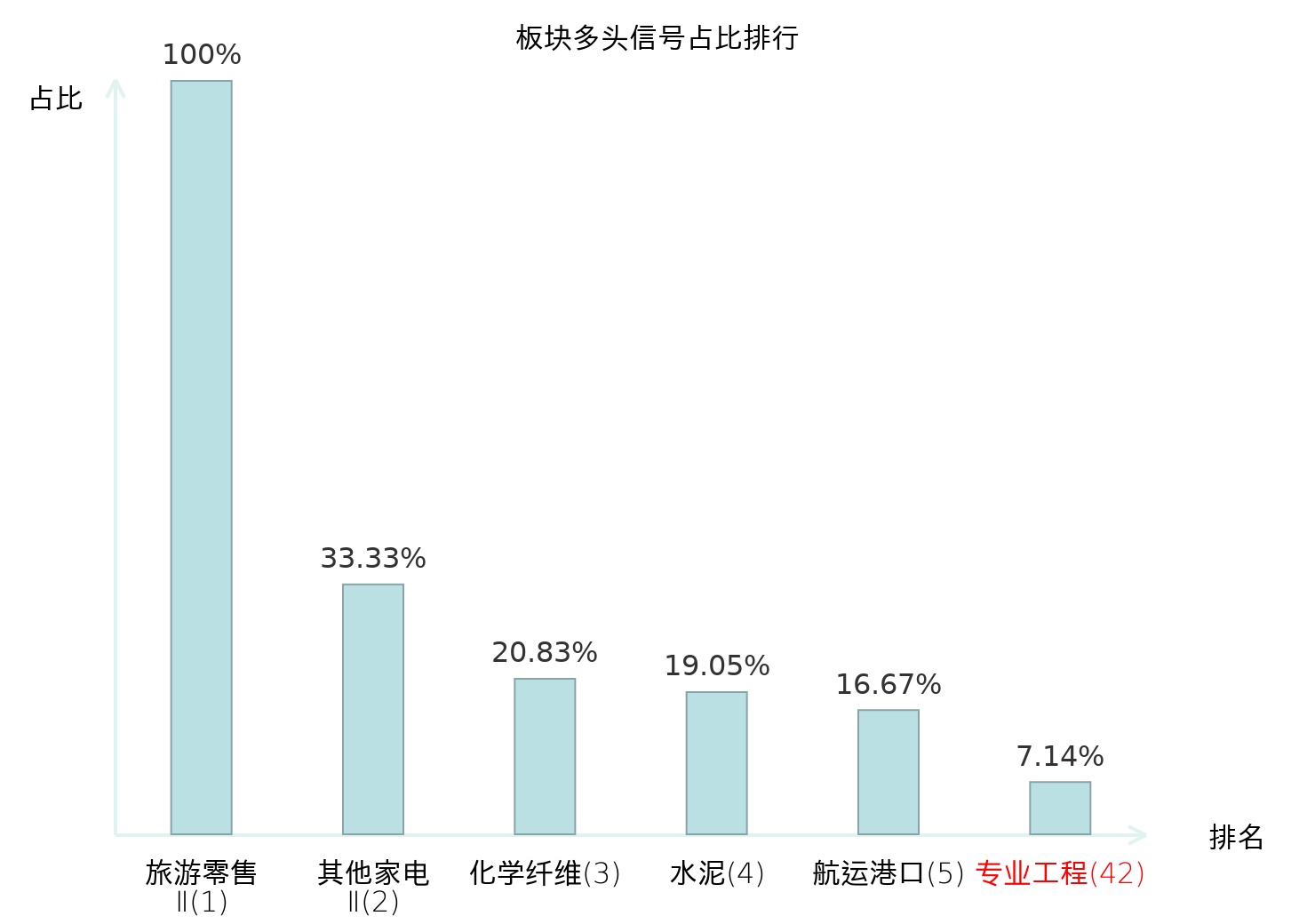 全市场所有行业板块中主力多头信号占比排名中,旅游零售Ⅱ板块位居第一。旅游零售Ⅱ板块名次提升最快,较昨日上升130位。