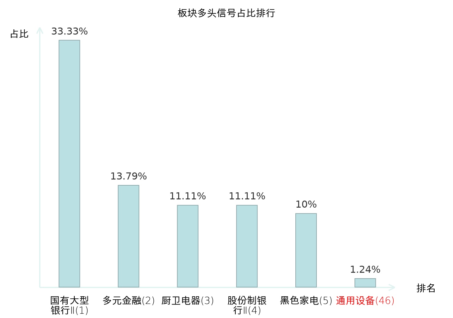 全市场所有行业板块中主力多头信号占比排名中,国有大型银行Ⅱ板块位居第一。股份制银行Ⅱ板块名次提升最快,较昨日上升115位。