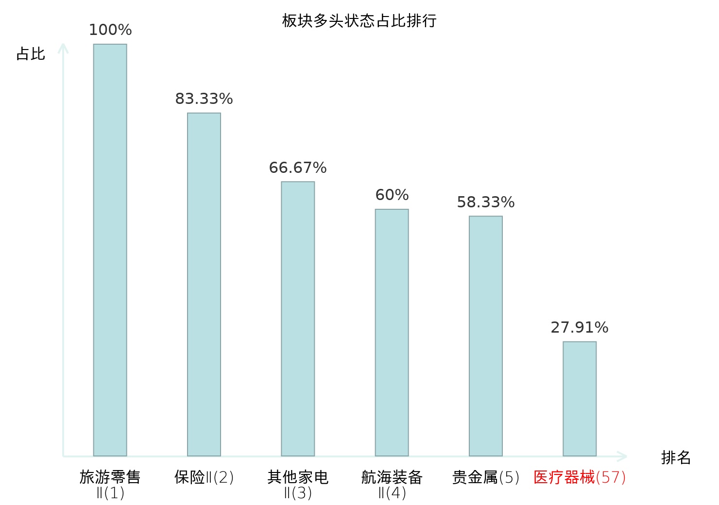 全市场所有行业板块中主力多头状态占比排名中,旅游零售Ⅱ板块位居第一。综合Ⅱ板块名次提升最快,较昨日上升69位。