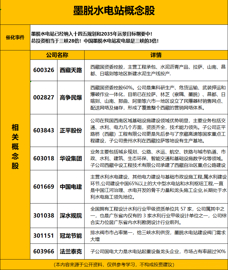保利联合:核心受益公司之二,民爆龙头。与三峡区别是三峡是浇筑坝体,墨脱水电站是堆石坝,石头多爆破用量大,调研测算三期工程十年炸药总量约900亿。保利联合和高争民爆联合成立合资公司,前者占比51%,该公司1.2万吨包装炸药目前处于试生产阶段,未来势必获得更多炸药订单。公司市值小,筹码结构较好,历史股性活跃,曾在2022年春节期间八连板,市场人气较旺,有望成为游资打造板块先锋龙头的潜在标的。