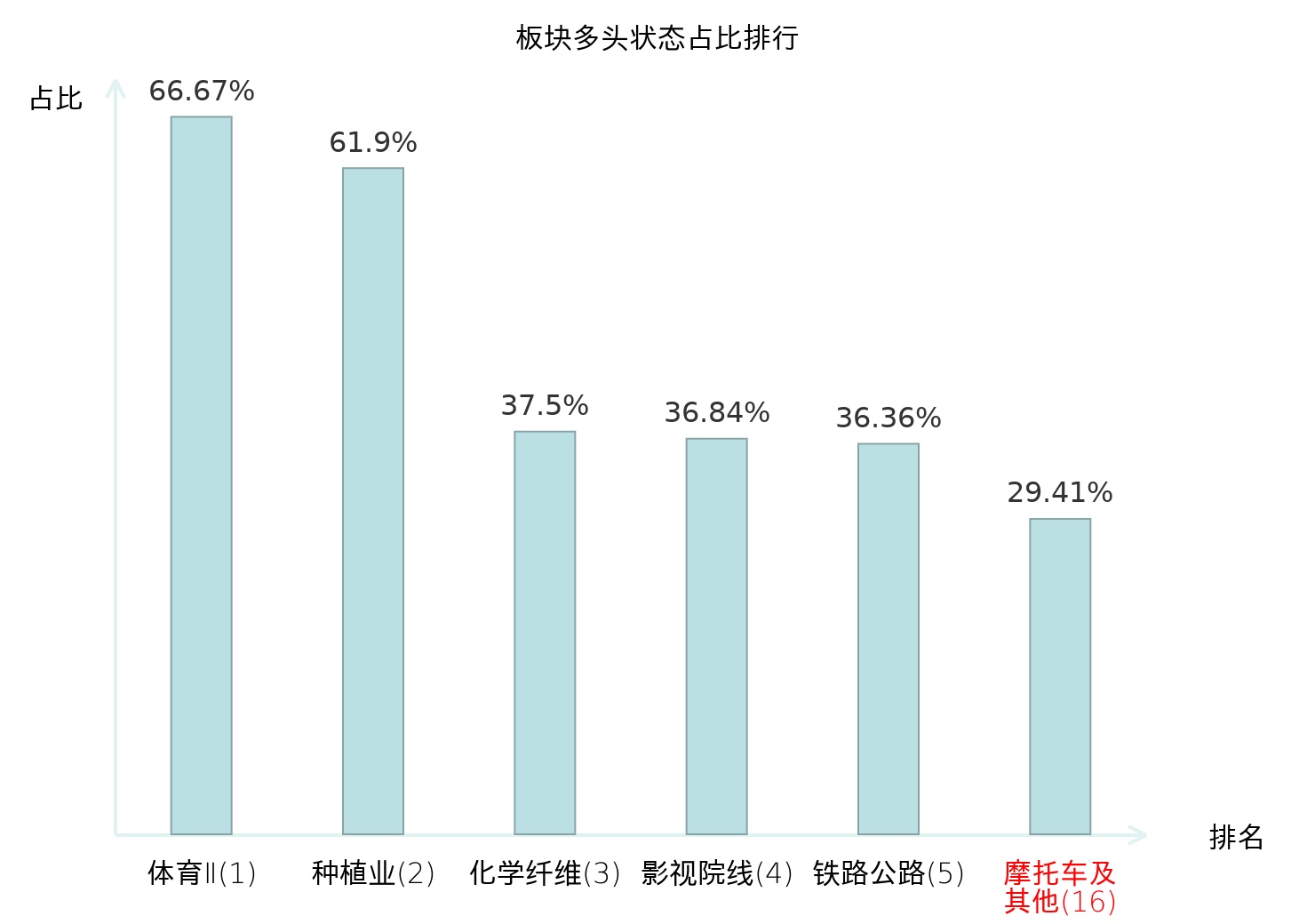 全市场所有行业板块中主力多头状态占比排名中,体育Ⅱ板块位居第一。种植业板块名次提升最快,较昨日上升65位。