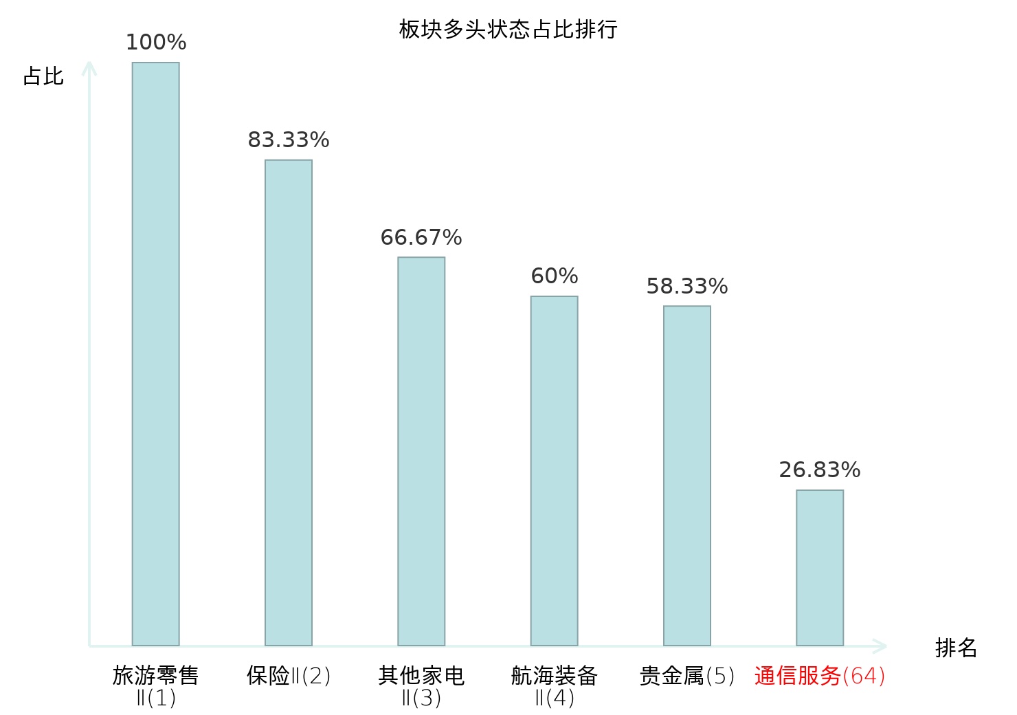 全市场所有行业板块中主力多头状态占比排名中,旅游零售Ⅱ板块位居第一。综合Ⅱ板块名次提升最快,较昨日上升69位。