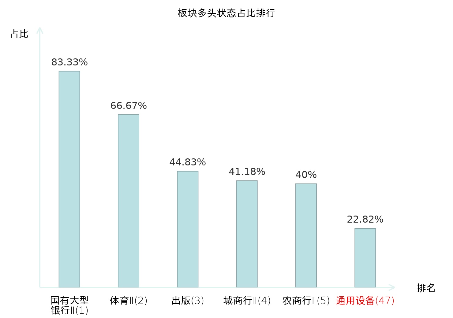 全市场所有行业板块中主力多头状态占比排名中,国有大型银行Ⅱ板块位居第一。焦炭Ⅱ板块名次提升最快,较昨日上升35位。