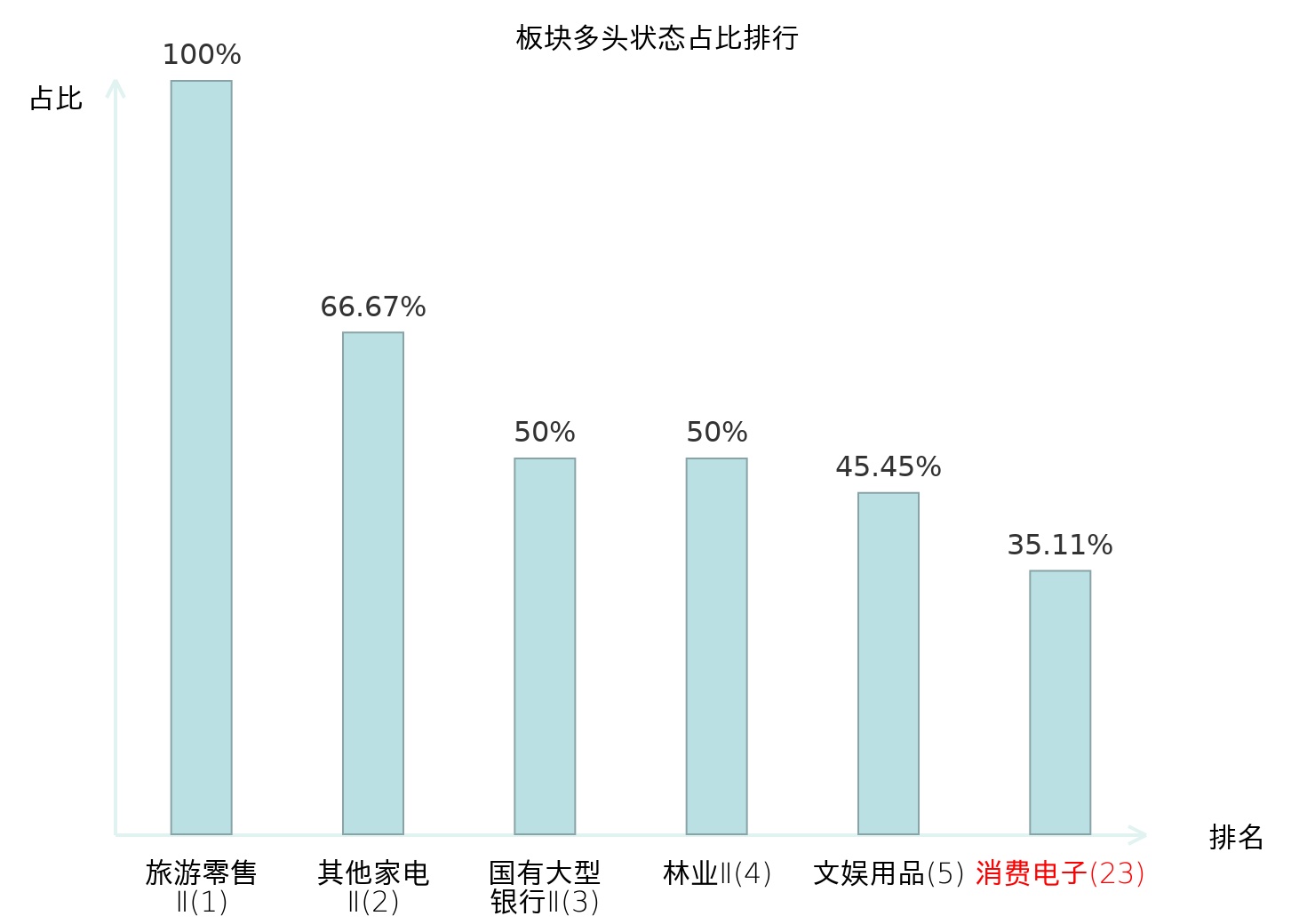全市场所有行业板块中主力多头状态占比排名中,旅游零售Ⅱ板块位居第一。农业综合Ⅱ板块名次提升最快,较昨日上升102位。