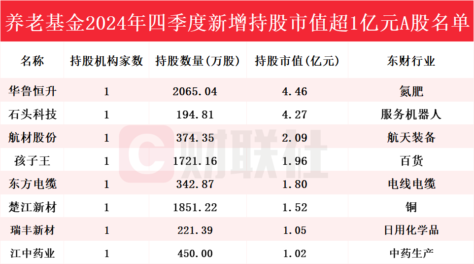 其中,养老基金新增持股市值超1亿元的个股共有8只,分别为华鲁恒升、石头科技、航材股份、孩子王、东方电缆、楚江新材、瑞丰新材和江中药业。具体情况如下图: