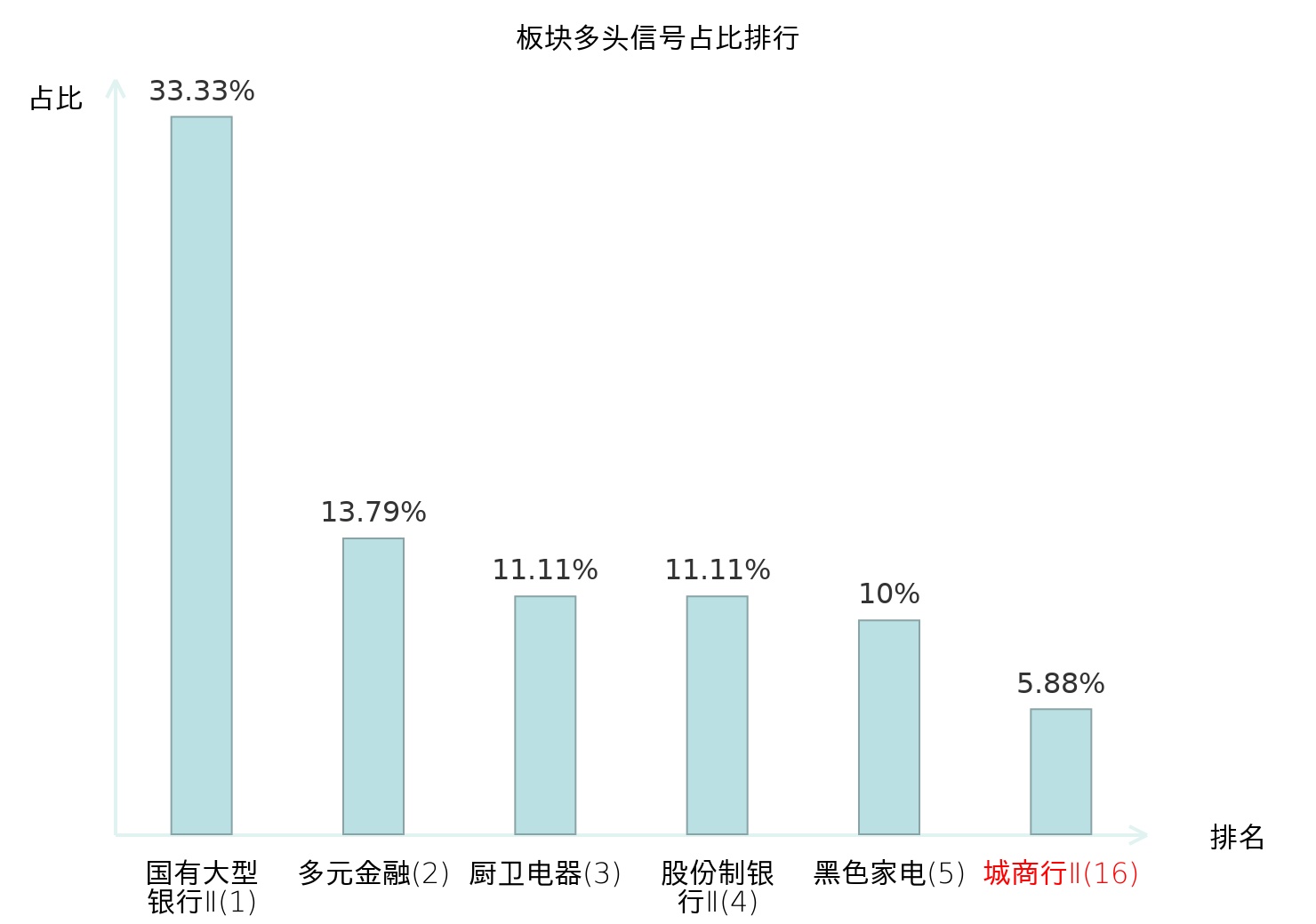 全市场所有行业板块中主力多头信号占比排名中,国有大型银行Ⅱ板块位居第一。股份制银行Ⅱ板块名次提升最快,较昨日上升115位。