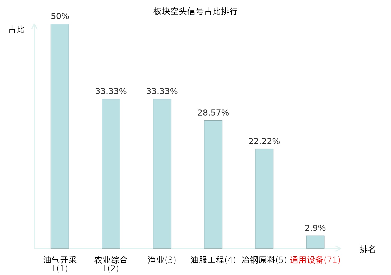 全市场所有行业板块中主力空头信号占比排名中,油气开采Ⅱ板块位居第一。医药商业板块名次提升最快,较昨日上升111位。
