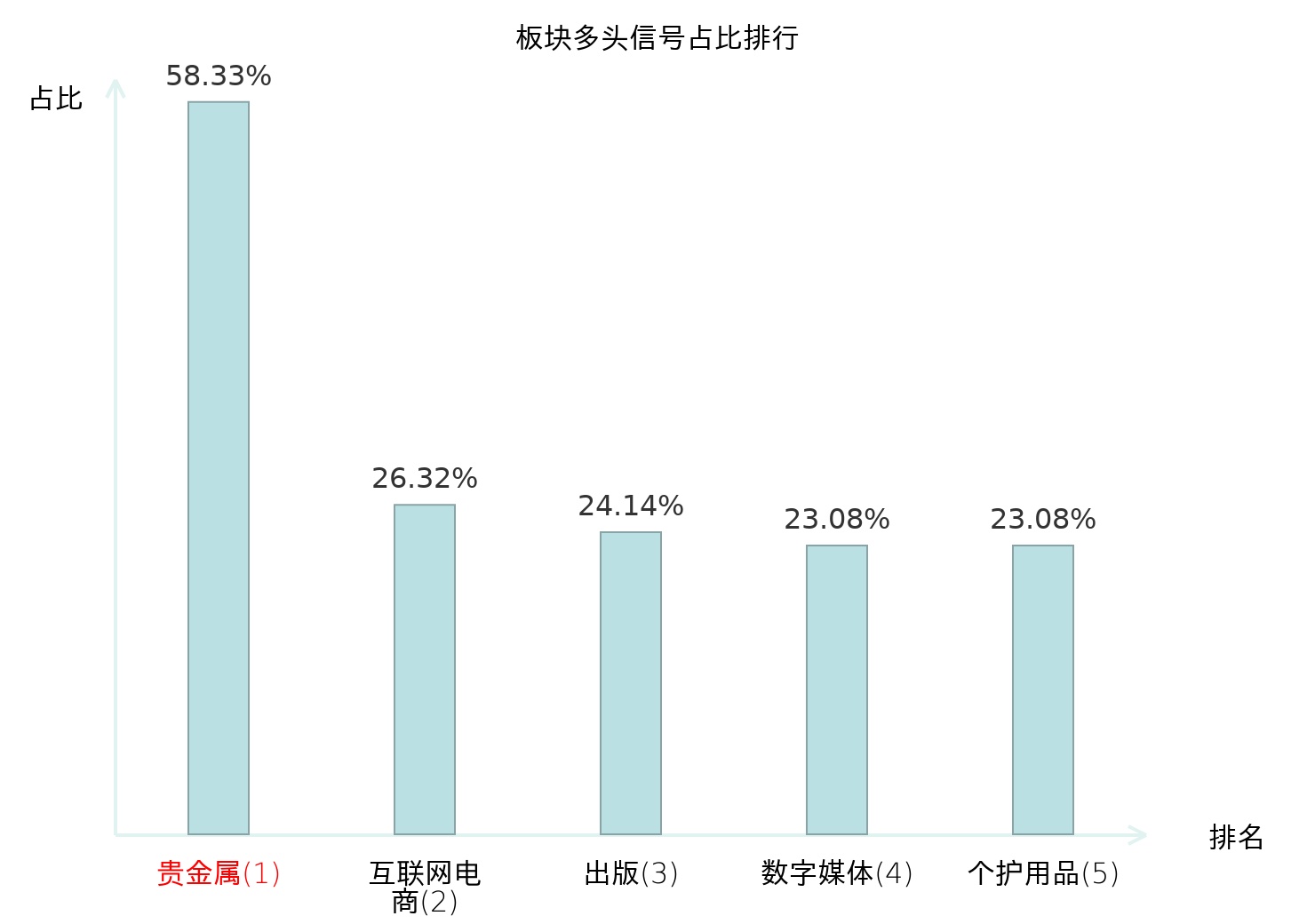 从主力宝信号数据分析,湖南黄金所属的贵金属板块中共有7只股票发出主力多头信号,主力多头信号占比在全行业中排名第1位,较昨日上升108位。排名高表明主力当日买入意愿较强,此次排名的大幅提升可能反映了主力对该板块态度的积极变化。全市场所有行业板块中,贵金属板块的主力多头信号占比排名仍居首位。贵金属板块的名次提升最快,较昨日上升108位。这些变动揭示了主力资金对该板块的强烈看好,为投资者提供了重要的市场情绪和投资机会参考。