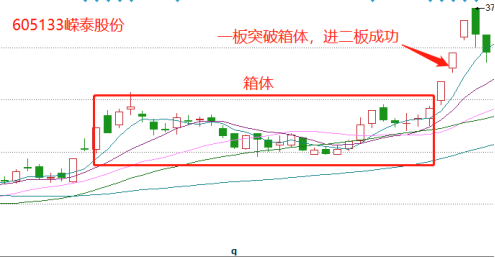 例:如下图605133嵘泰股份,一板突破箱体后,进二板成功。