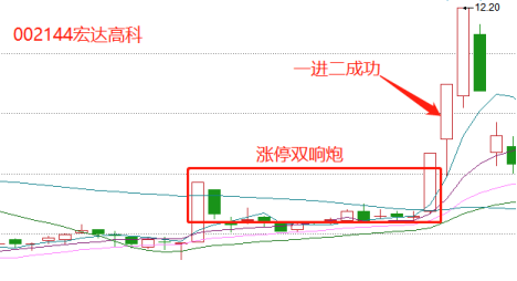 例:如下图002144宏达高科就是典型涨停双响炮一进二成功案例。