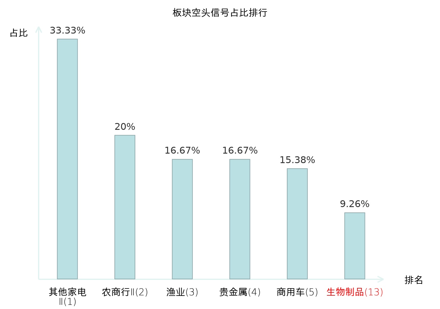 全市场所有行业板块中主力空头信号占比排名中,其他家电Ⅱ板块位居第一。医疗器械板块名次提升最快,较昨日上升119位。