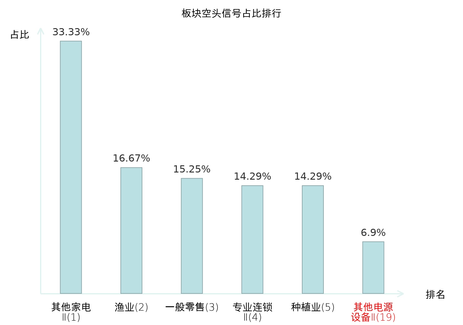 全市场所有行业板块中主力空头信号占比排名中,其他家电Ⅱ板块位居第一。造纸板块名次提升最快,较昨日上升115位。
