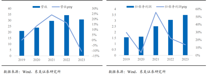 图表3:2018-2023 年公司营业收入及增速(亿元)(左)2018-2023 年公司归母净利润及增速(亿元)(右)