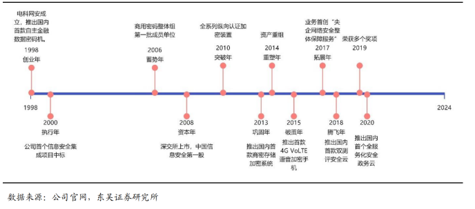 公司成立于1998年,国内领先的密码产品、网络安全产品、安全运维服务和行业安全解决方案的综合提供商。作为中国电科(CETC)旗下中国网安(CCSC)的控股子公司,公司也是中国电科、中国网安在网络信息安全领域的唯一上市平台。公司始终专注于网络信息安全领域,为党政、军队、大型央企等重要领域客户提供专业的产品和服务。经过20余年的发展,公司已经构建了一个全面的产品体系,覆盖了从芯片、模块、平台、整机到系统、整体解决方案与安全服务。公司累计服务用户超过10000家,在北京奥运会/冬奥会、杭州G20峰会、上海世博会、党的“二十大”等国家重大活动的信息安全保障工作中发挥了重要作用。