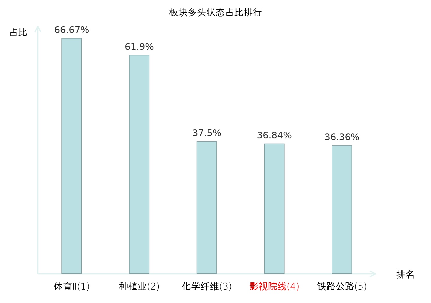 全市场所有行业板块中主力多头状态占比排名中,体育Ⅱ板块位居第一。种植业板块名次提升最快,较昨日上升65位。