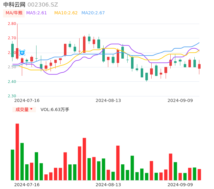 09月09日,中科云网收报2.52,股价涨幅0.80%,成交金额1663.75万,换手率0.82%。