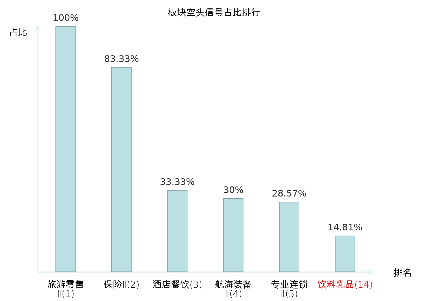全市场所有行业板块中主力空头信号占比排名中,旅游零售Ⅱ板块位居第一。风电设备板块名次提升最快,较昨日上升101位。