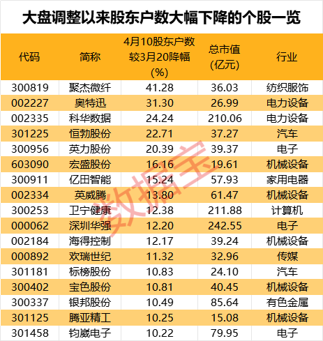 据证券时报•数据宝统计,截至4月11日,有170多只个股同时披露4月10日及3月20日的股东户数,其中17股4月10日的股东户数较3月20日降幅超10%,聚杰微纤等5股大盘调整以来股东户数降幅超20%。