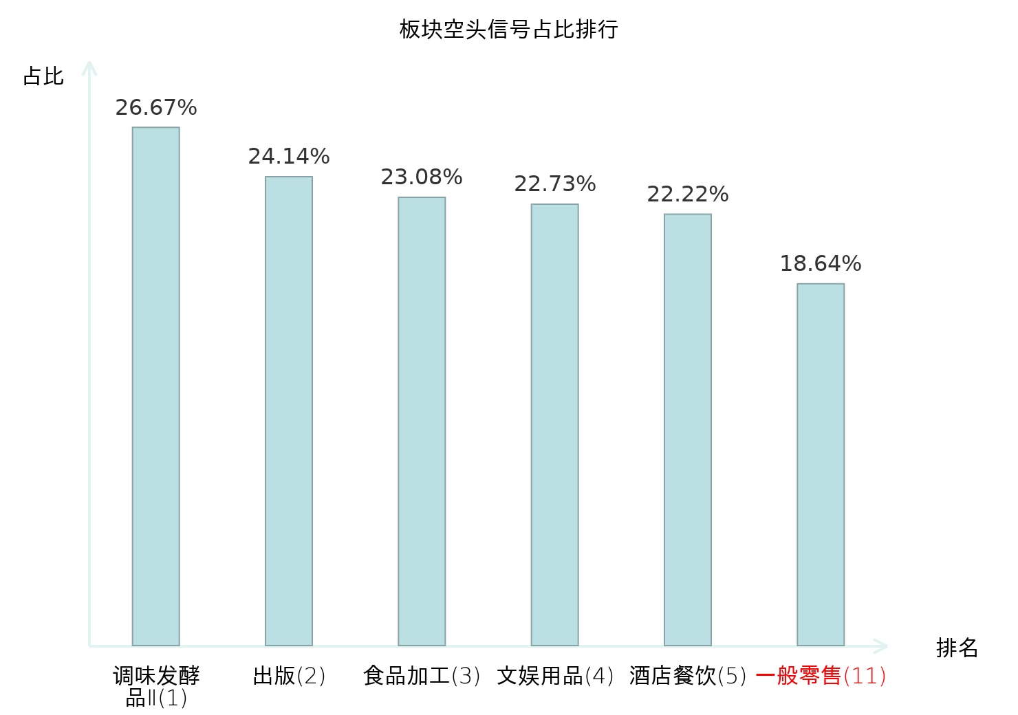 全市场所有行业板块中主力空头信号占比排名中,调味发酵品Ⅱ板块位居第一。中药Ⅱ板块名次提升最快,较昨日上升110位。