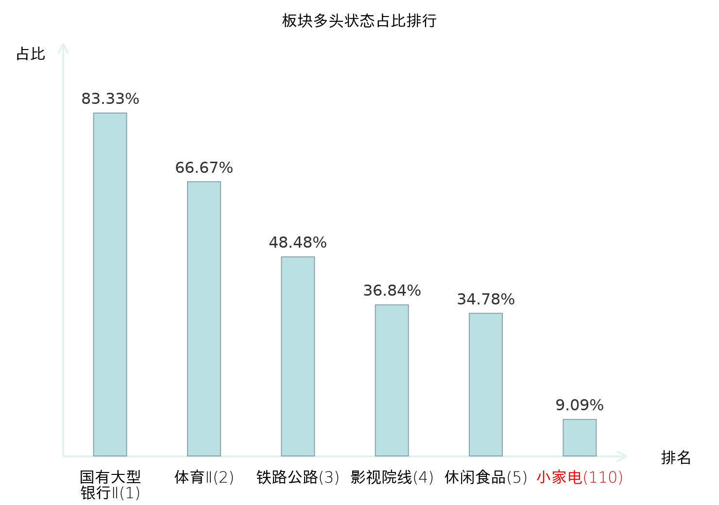 全市场所有行业板块中主力多头状态占比排名中,国有大型银行Ⅱ板块位居第一。个护用品板块名次提升最快,较昨日上升69位。