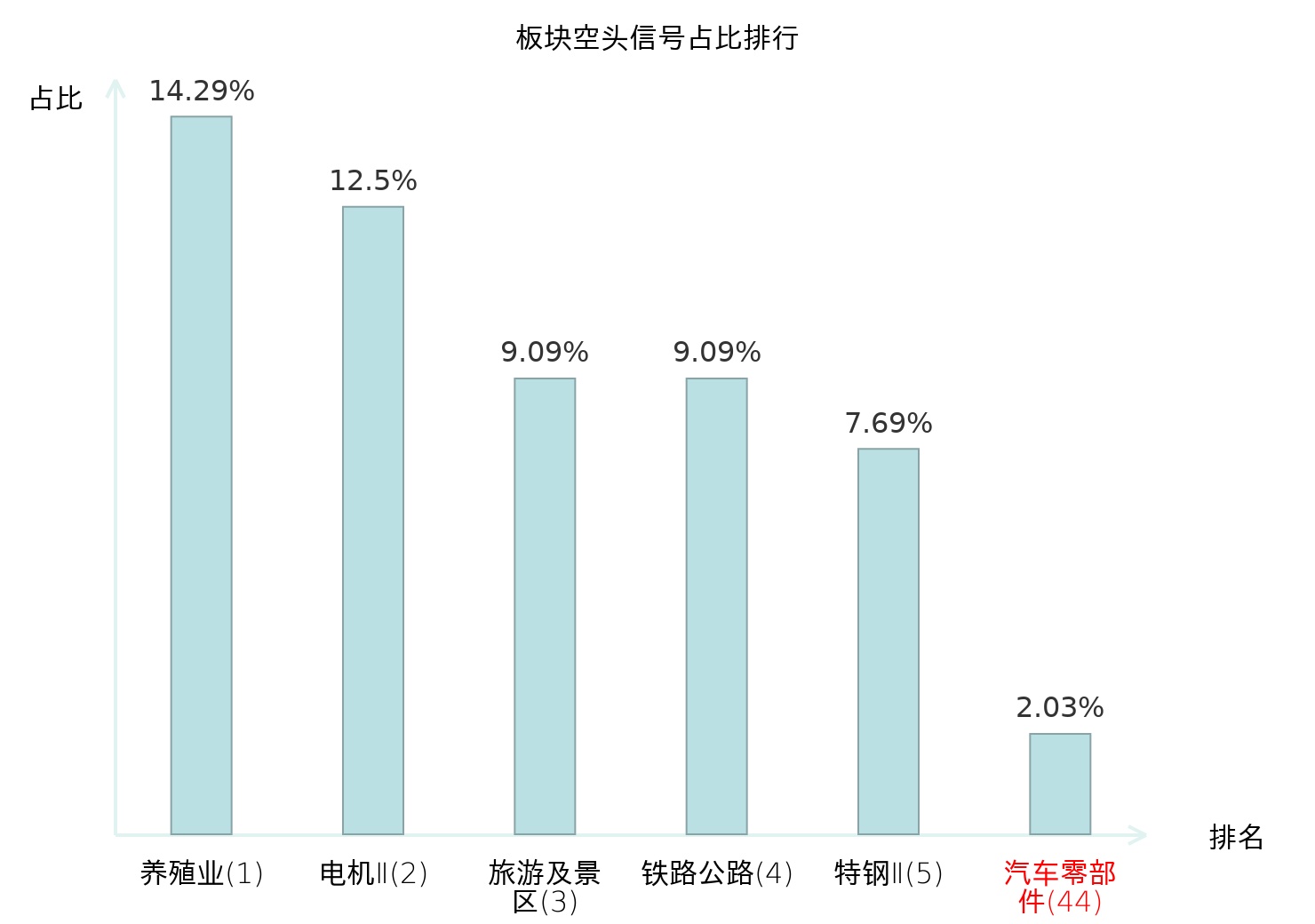 全市场所有行业板块中主力空头信号占比排名中,养殖业板块位居第一。电机Ⅱ板块名次提升最快,较昨日上升118位。