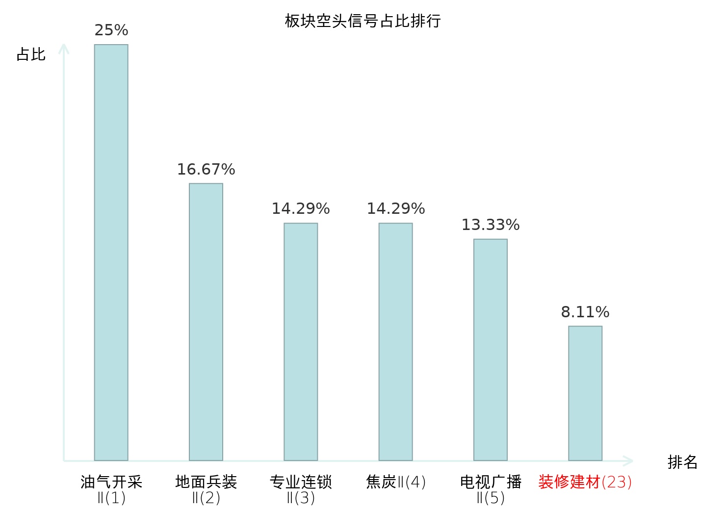 全市场所有行业板块中主力空头信号占比排名中,油气开采Ⅱ板块位居第一。化妆品板块名次提升最快,较昨日上升102位。