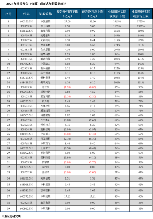 2023年业绩预增较高的军工企业: