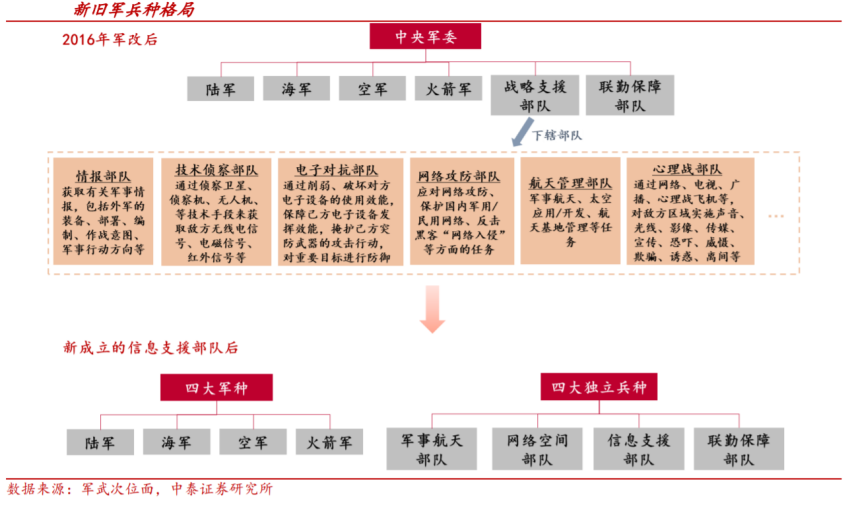 新型军兵种布局立足发展新质战斗力,使协同作战体系向专业化及智能化更进一步。本轮改革前,战略支援部队是海陆空火后的第五大军种(军种是军队内按主要作战领域、使命和装备划分的基本类别,是主要的军事服务分支,目前我国军种主要有:陆军、海军、空军、火箭军等)。