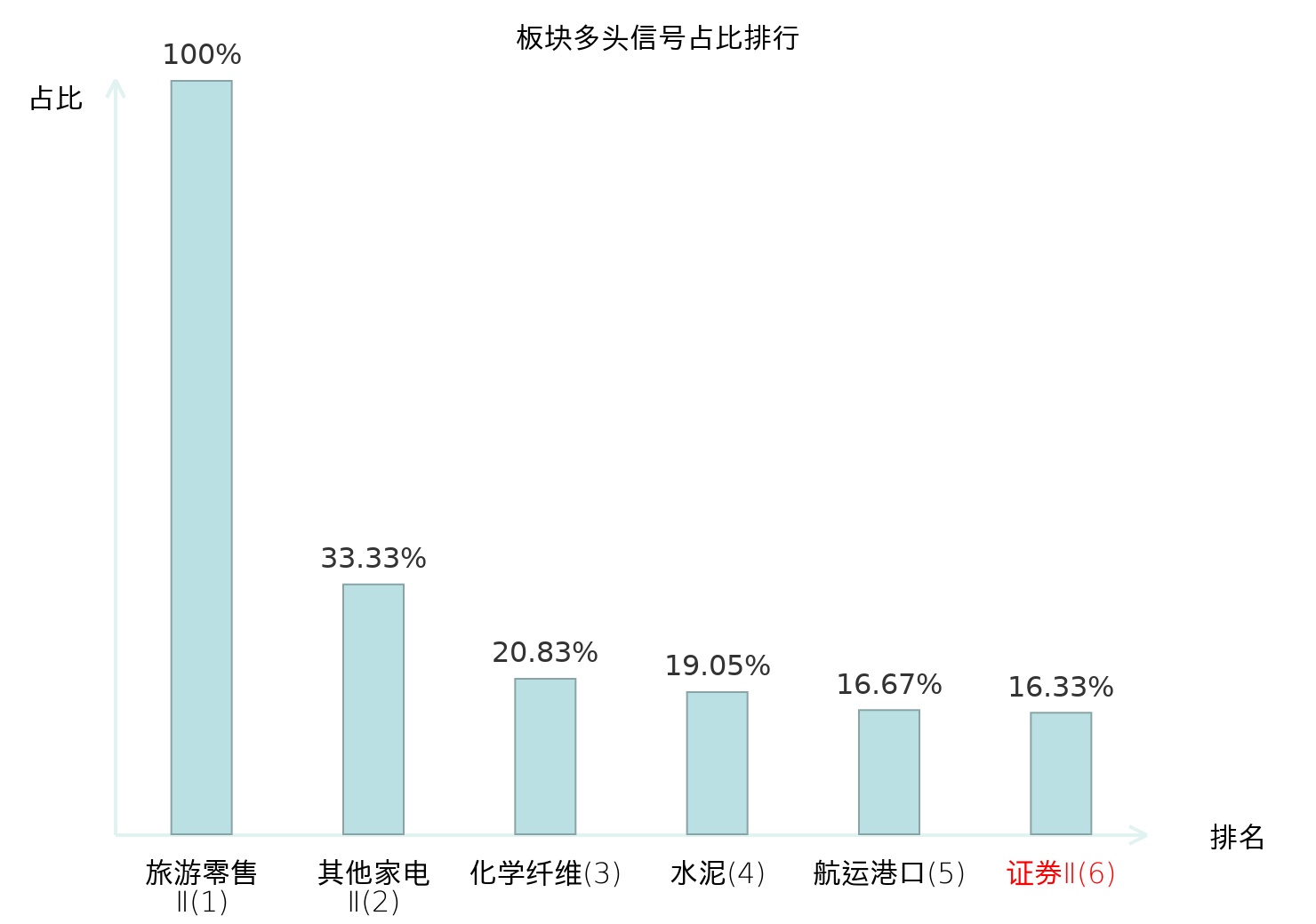 全市场所有行业板块中主力多头信号占比排名中,旅游零售Ⅱ板块位居第一。旅游零售Ⅱ板块名次提升最快,较昨日上升130位。