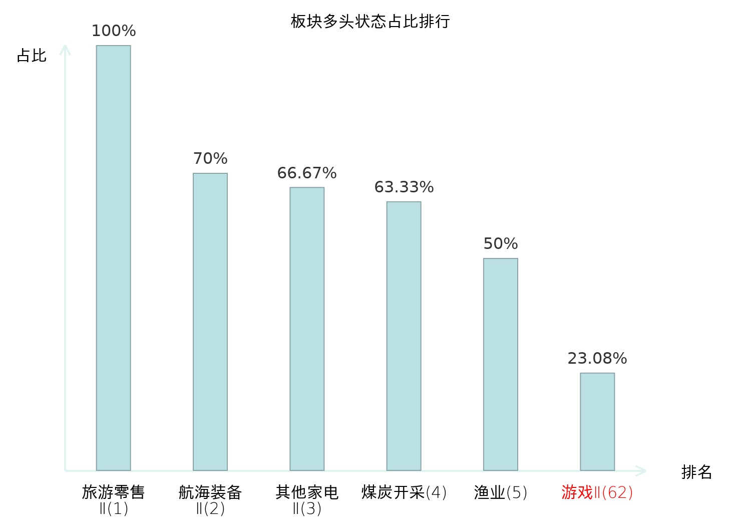 全市场所有行业板块中主力多头状态占比排名中,旅游零售Ⅱ板块位居第一。其他家电Ⅱ板块名次提升最快,较昨日上升127位。