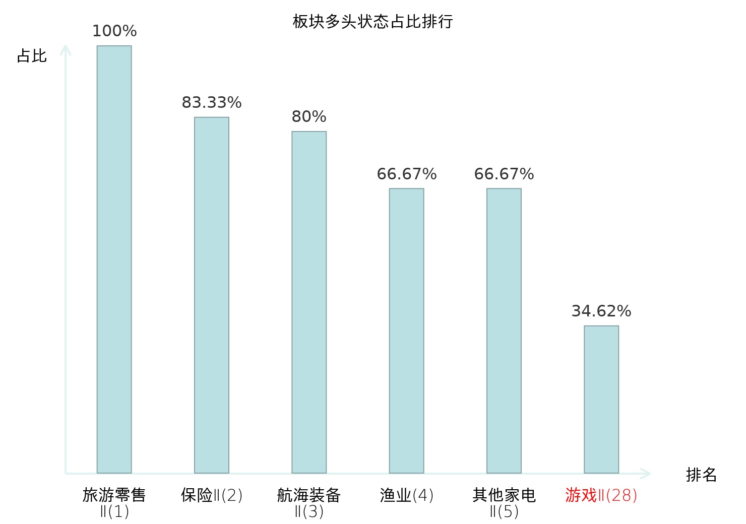 全市场所有行业板块中主力多头状态占比排名中,旅游零售Ⅱ板块位居第一。证券Ⅱ板块名次提升最快,较昨日上升106位。