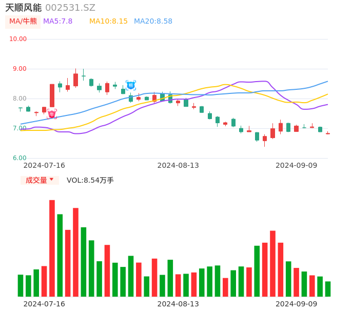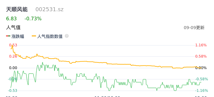 09月09日,天顺风能收报6.83,股价涨幅-0.73%,成交金额5840.96万,换手率0.48%。