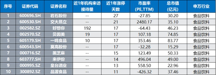 注:近1年涨停次数居前的食品饮料股(截至4月11日收盘)