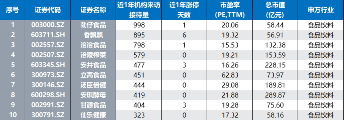 对于可关注标的方面,筛选食品饮料概念股,累计共有27股近1年机构调研量在100次以上,其中,劲仔食品、香飘飘、洽洽食品、涪陵榨菜、安井食品、立高食品、汤臣倍健、安琪酵母、甘源食品、仙乐健康等股调研量居前。若以股价活跃度统计,不计算ST股,岩石股份、交大昂立、好想你、贝因美、一鸣食品等股近1年涨停次数较多。