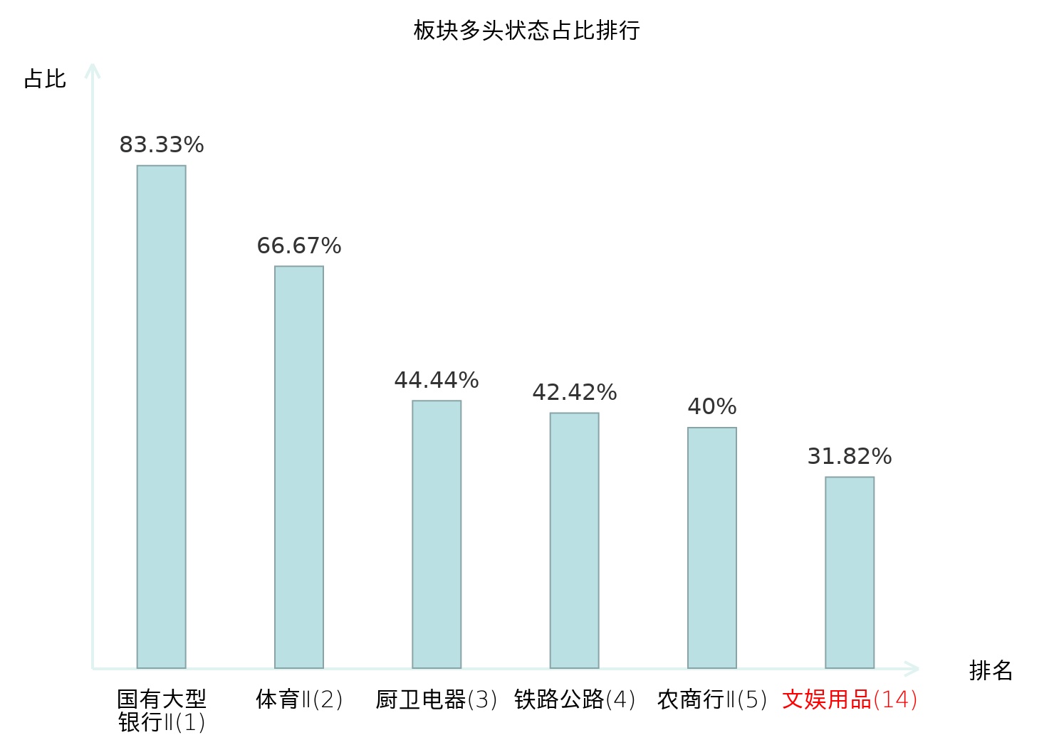 全市场所有行业板块中主力多头状态占比排名中,国有大型银行Ⅱ板块位居第一。包装印刷板块名次提升最快,较昨日上升30位。