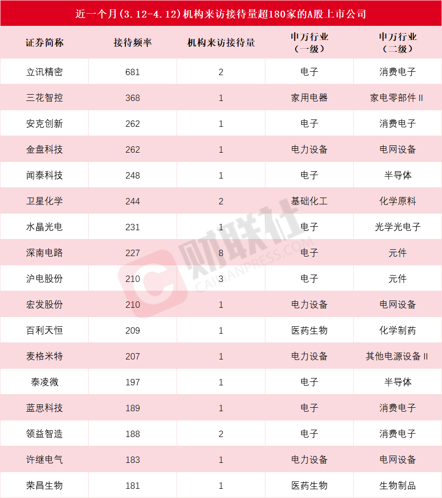 据Choice数据显示,截至发稿,近一个月(3.12-4.12)包括立讯精密、三花智控、安克创新、金盘科技、闻泰科技、卫星化学、水晶光电、深南电路、沪电股份、宏发股份、百利天恒、麦格米特、泰凌微、蓝思科技、领益智造、许继电气和荣昌生物在内的17家上市公司机构来访接待量超180家,具体情况见下图: