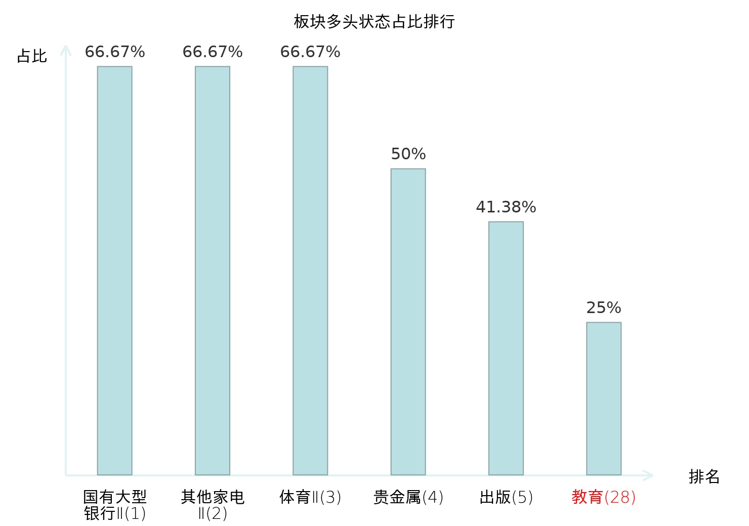 全市场所有行业板块中主力多头状态占比排名中,国有大型银行Ⅱ板块位居第一。林业Ⅱ板块名次提升最快,较昨日上升96位。