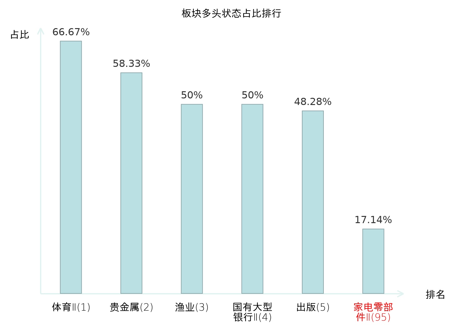 全市场所有行业板块中主力多头状态占比排名中,体育Ⅱ板块位居第一。医药商业板块名次提升最快,较昨日上升69位。