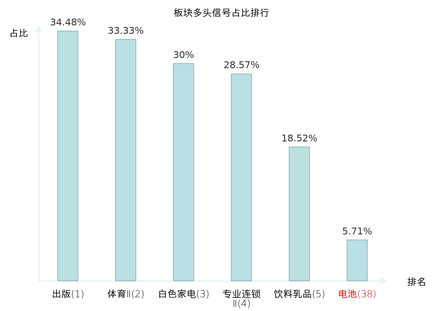 全市场所有行业板块中主力多头信号占比排名中,出版板块位居第一。体育Ⅱ板块名次提升最快,较昨日上升128位。