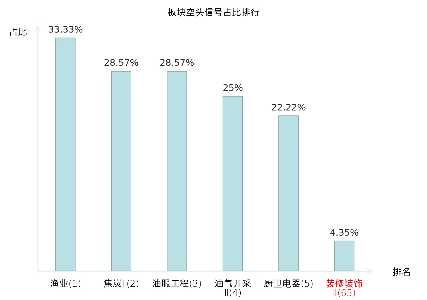 全市场所有行业板块中主力空头信号占比排名中,渔业板块位居第一。农产品加工板块名次提升最快,较昨日上升112位。