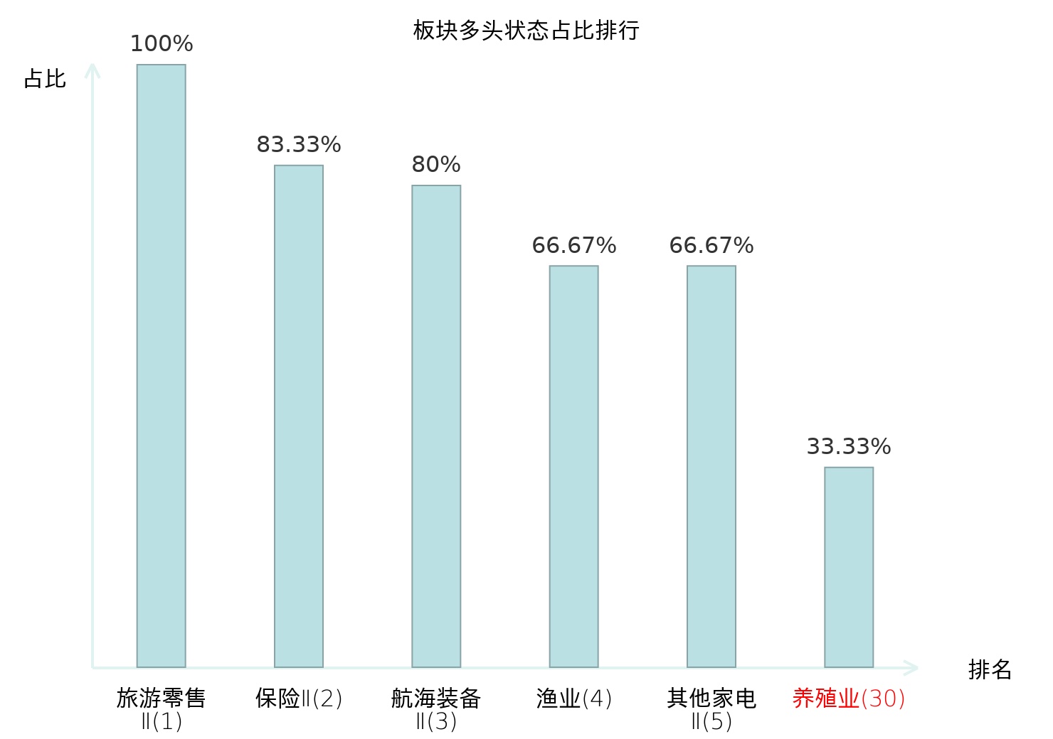 全市场所有行业板块中主力多头状态占比排名中,旅游零售Ⅱ板块位居第一。证券Ⅱ板块名次提升最快,较昨日上升106位。