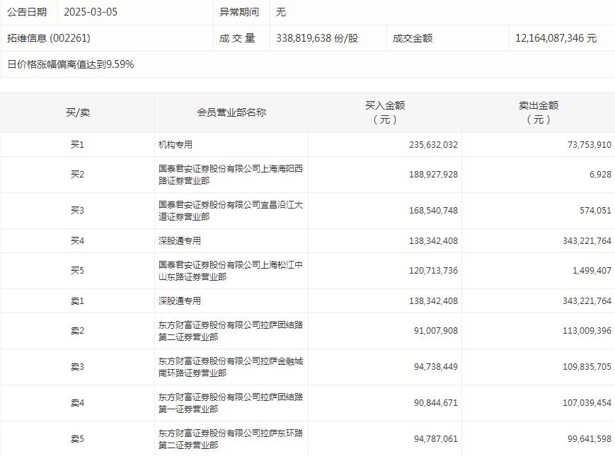 拓维信息今天涨停。盘后数据显示,1家机构出现在龙虎榜单上,净买入1.62亿元;国泰君安证券股份有限公司上海海阳西路证券营业部买入1.89亿元,同时卖出0.69万元;东方财富证券股份有限公司拉萨东环路第二证券营业部买入9478.71万元,同时卖出9964.16万元。