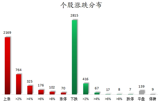 个股涨跌情况,截至收盘,沪深两市合计2169只个股上涨,2815只个股下跌,平盘个股139只,停牌的个股9只。不含当日上市新股,共有70只个股涨停,7只个股跌停。
