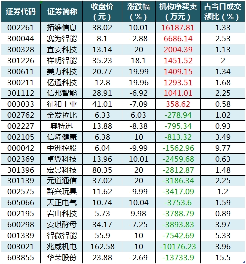 盘后龙虎榜数据显示,今日机构席位资金合计净卖出约2.78亿元。其中,净买入的个股8只,净卖出的个股14只。机构净买入最多的股票是拓维信息,净买入金额约1.62亿元;机构净买入居前的还有赛为智能、宜安科技等。机构净卖出最多的股票是华荣股份,净卖出金额约1.37亿元;机构净卖出居前的还有兆威机电、智微智能、安琪酵母等股。