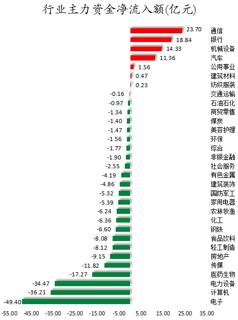 从行业来看,申万所属的31个一级行业,今日有7个行业主力资金呈现净流入,其中,通信行业主力资金净流入最多,净流入金额为23.7亿元;行业主力资金净流入居前的还有银行、机械设备、汽车等,净流入金额分别为18.84亿元、14.33亿元、11.36亿元。24个行业主力资金呈现净流出,其中,电子行业主力资金净流出最多,净流出金额为49.4亿元;行业主力资金净流出靠前的还有计算机、电力设备、医药生物、传媒、房地产等,净流出金额分别为36.21亿元、34.47亿元、17.27亿元、11.82亿元、9.15亿元。