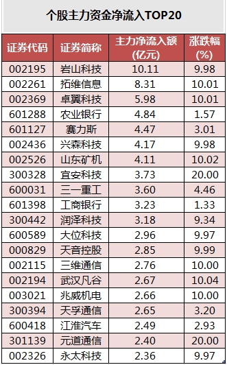 从个股来看,今日有2107只个股获主力资金净流入,其中,76股获主力资金净流入超1亿元。岩山科技主力资金净流入最多,净流入金额为10.11亿元;主力资金净流入居前的个股还有拓维信息、卓翼科技、农业银行、赛力斯、兴森科技等,净流入金额分别为8.31亿元、5.98亿元、4.84亿元、4.47亿元、4.17亿元。
