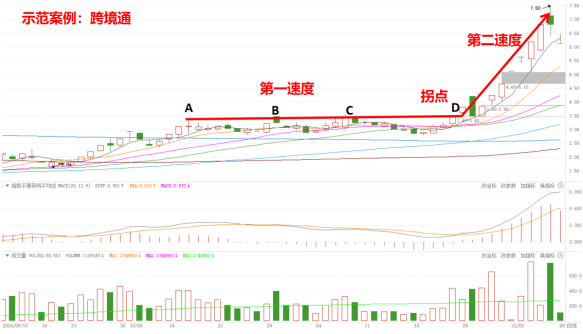 对于老庄股来说,绝大部分筹码都集中在主力手中,主力不卖出,散户手中也没有什么可买卖的筹码,这种庄股在加速度拐点时,不需要放很大成交量。