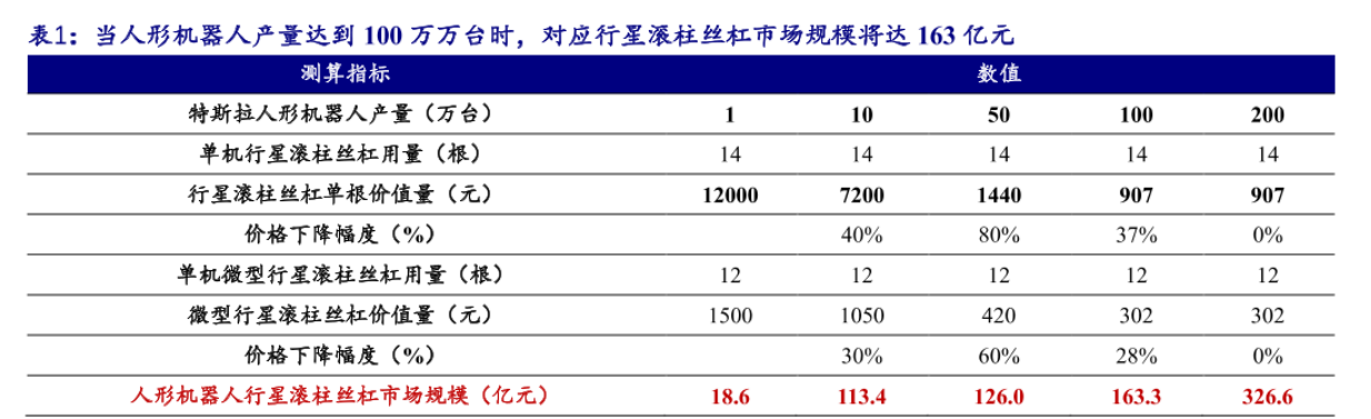 根据我们测算,当人形机器人产量达到 100 万、200 万台时, 对应行星滚柱丝杠市场规模分别达到 163 亿元、327 亿元。目前国内行星滚珠丝杠的产能高度稀缺,一方面受制于高端磨削机床设备需要进口,一方面是因为滚柱丝杠技术壁垒较高,就算有设备,还需要技术和经验数据的不断积累。目前国内滚柱丝杠国内企业也都在积极的进行资本开支,给下游机器人大厂送样。