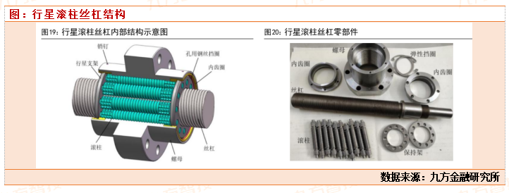 丝杠是一种常见的机械传动运动,用于将旋转运动转为直线运动。可以分为滑动丝杠(多为梯形丝杠)、滚珠丝杠、行星滚柱丝杠、静压丝杠。梯形丝杠和滚珠丝杠在机械机床领域已成熟应用,行星滚柱丝杠目前仅在航空等高端领域应用,国内国产化率低,且行业市场空间相对其他环节来说,是较大的。