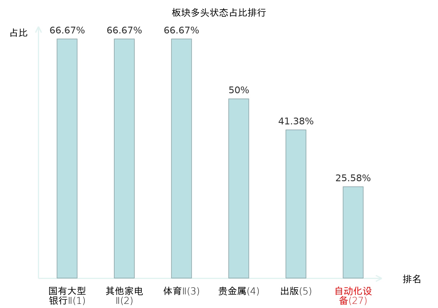 全市场所有行业板块中主力多头状态占比排名中,国有大型银行Ⅱ板块位居第一。林业Ⅱ板块名次提升最快,较昨日上升96位。